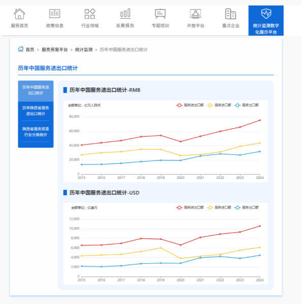 平台(二期)集权威报告发布与数据查询于一体,有效提升陕西服务贸易数字化水平,为省内广大服务贸易企业提供全方位、一站式的公共服务。